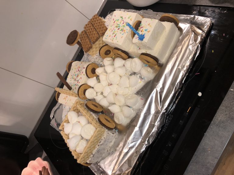Vispa grädden. Bygg tåget som på bilden med hjälp av glassen. Dela det ena på hälften och lägg ovanpå det andra. Ytterligare ett paket blir en vagn.