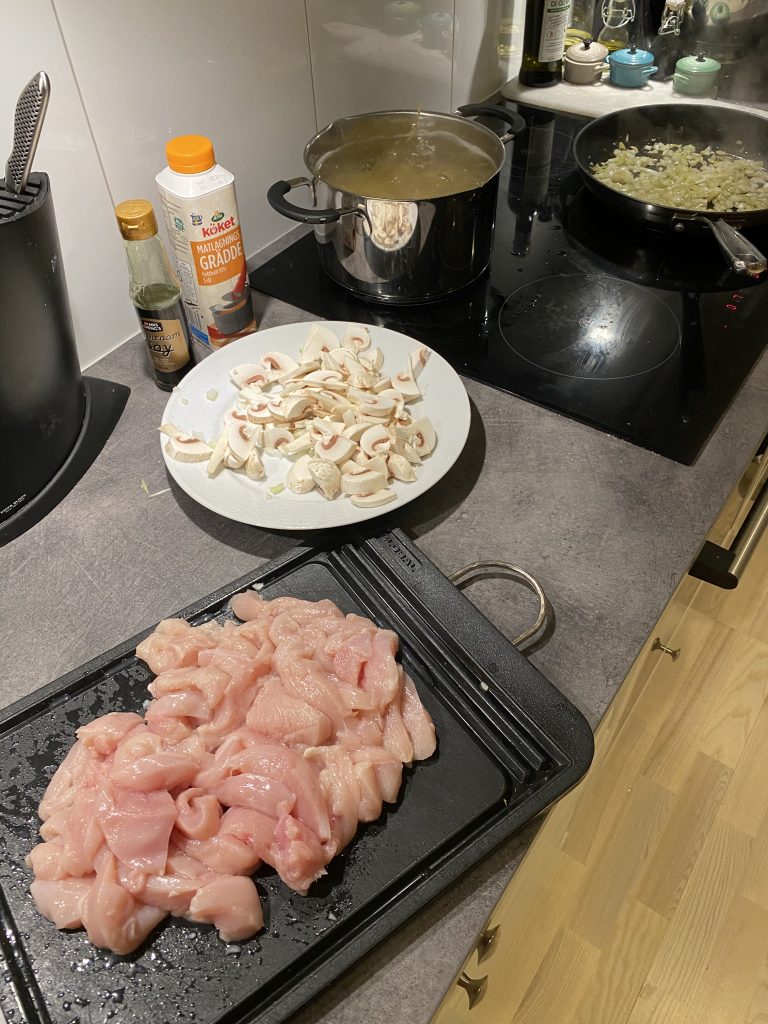 Lägg i champinjonerna när kycklingen har stekt på sig lite